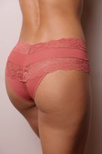 Calcinha que intercala renda e microfibra acetinada com suave brilho, dando toda a volta no quadril sem elásticos. Não marca na roupa e não aperta. Parte inferior em tecido. Fundinho em algodão 100%.