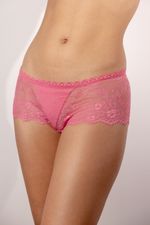 Shortinho com detalhe na frente em Tule Poá forrado por microfibra acetinada. A renda nasce na frente e contorna todo o corpo seguindo até a parte de trás, sem emendas. A rendinha estreita fica aplicada na cintura com elastiquinho embutido para maior firmeza. Fundinho em microfibra com forro 100% algodão. Logo metálico aplicado na parte de trás.