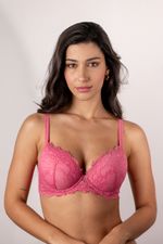 Sutiã com bojo amplo e macio, que acomoda seios volumosos. Taças revestidas por renda com franjas de contorno que enriquecem o decote e o cós. Base toda rendada com forrinho de tule poá. As barbatanas laterais proporcionam maior estabilidade para o sutiã. A parte de trás é muito confortável em microfibra acetinada com suave brilho. Alças elásticas com aplicação de rendinha na frente e a parte de trás é ajustável. Argolas e passadores dourados. Logo metálico aplicado na parte de trás. Fecho com 4 opções de regulagem.