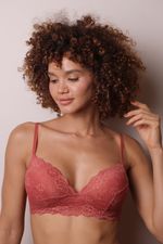 Sutiã rendado com bojo amplo e profundo, que modela os seios sem aumentar. Taças revestidas por renda. As laterais em tecido possuem barbatanas que ajudam a dar firmeza ao sutiã. Alças elásticas ajustáveis. Para os tamanhos 46 e 48 as alças são mais largas. Fecho com tripla regulagem. Compatível com Extensor A.