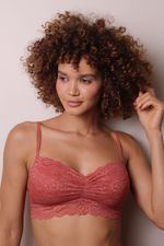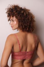 Top todo rendado, sem arco e sem bojo. Taças forradas com tecido, evitam transparência e ajudam na sustentação. O franzido no entresseio faz o top vestir com perfeição. Base e costas em renda. Detalhe de 3 alcinhas fininhas na frente. Alças elásticas ajustáveis na parte de trás.